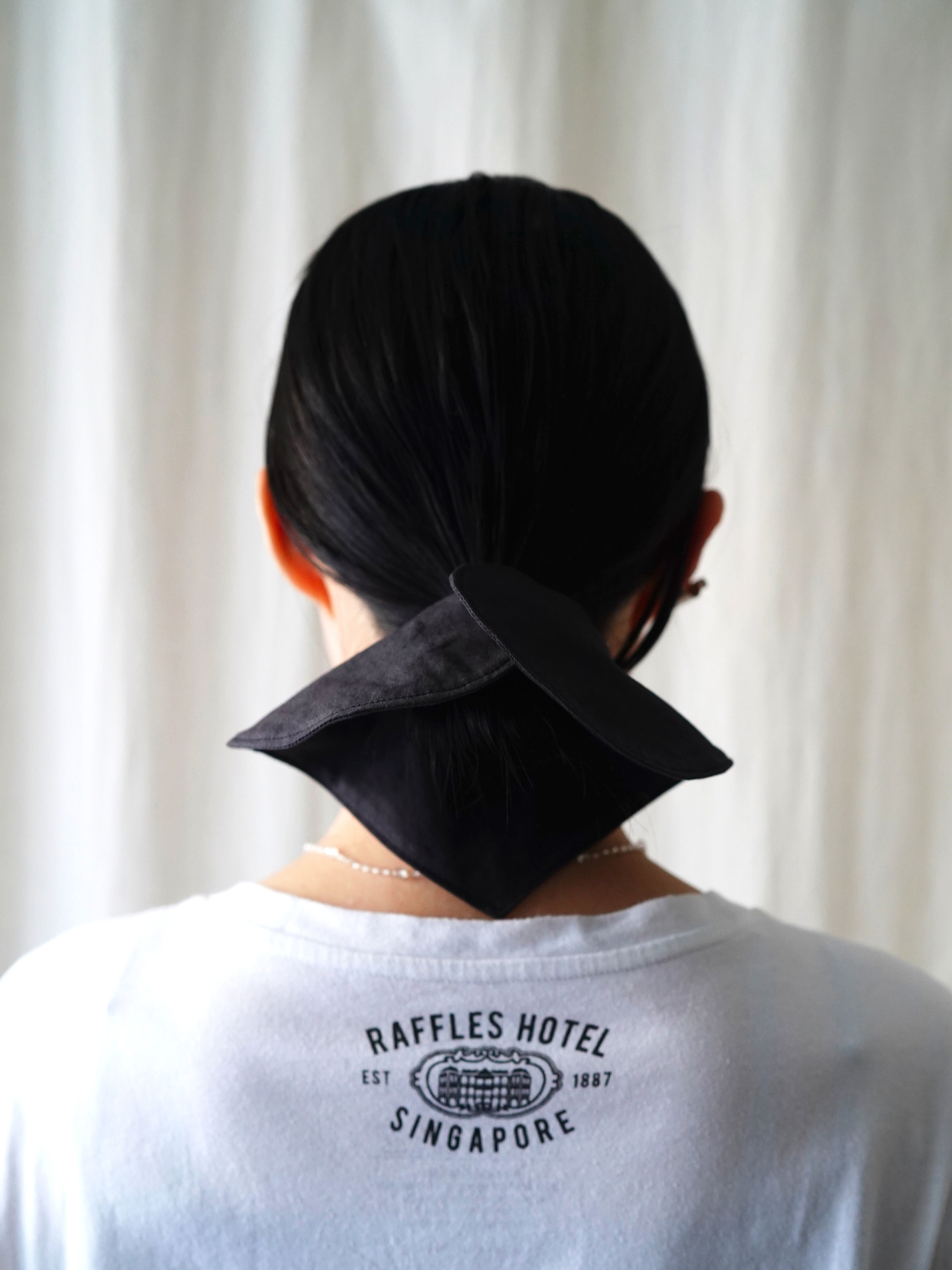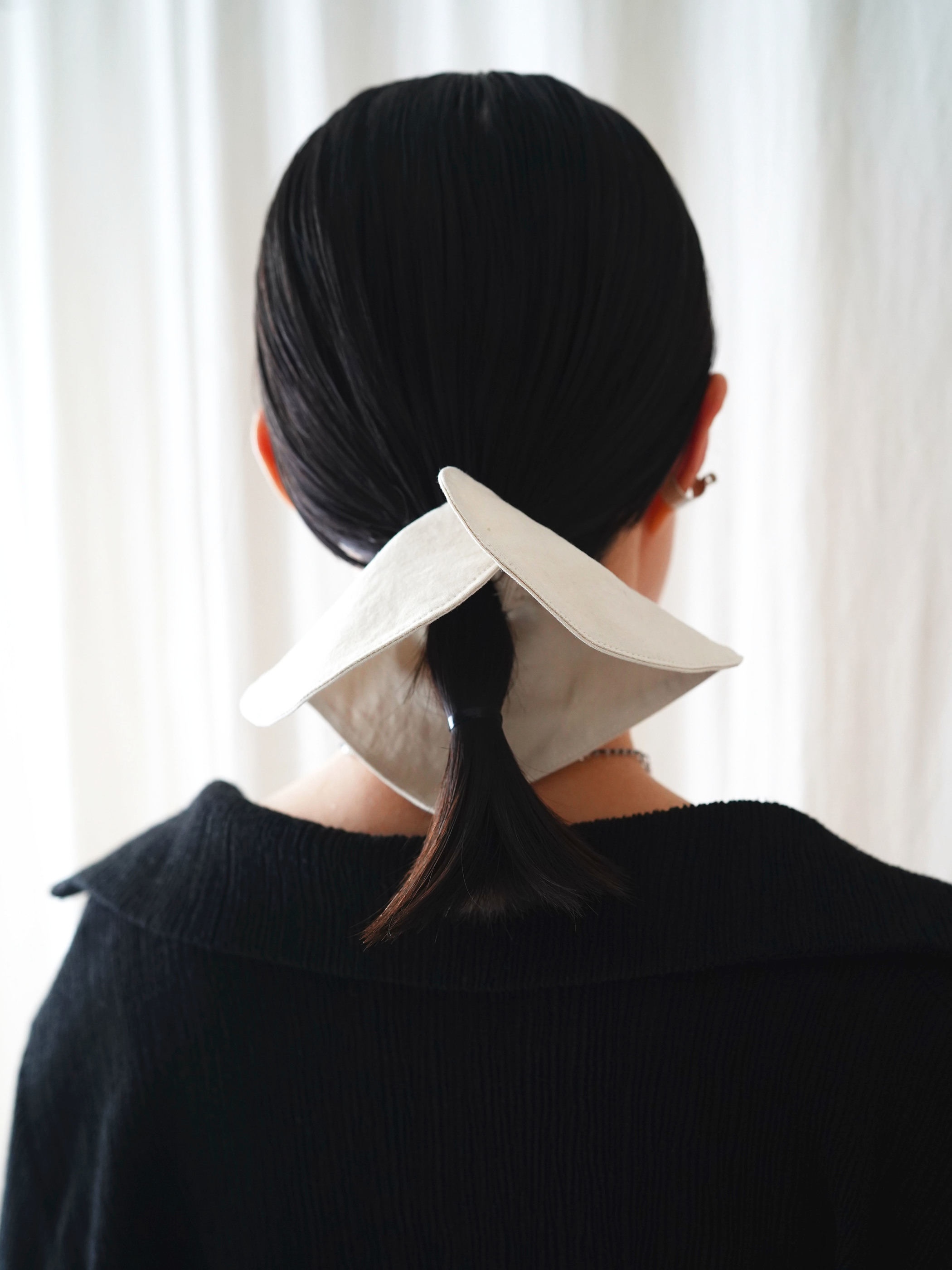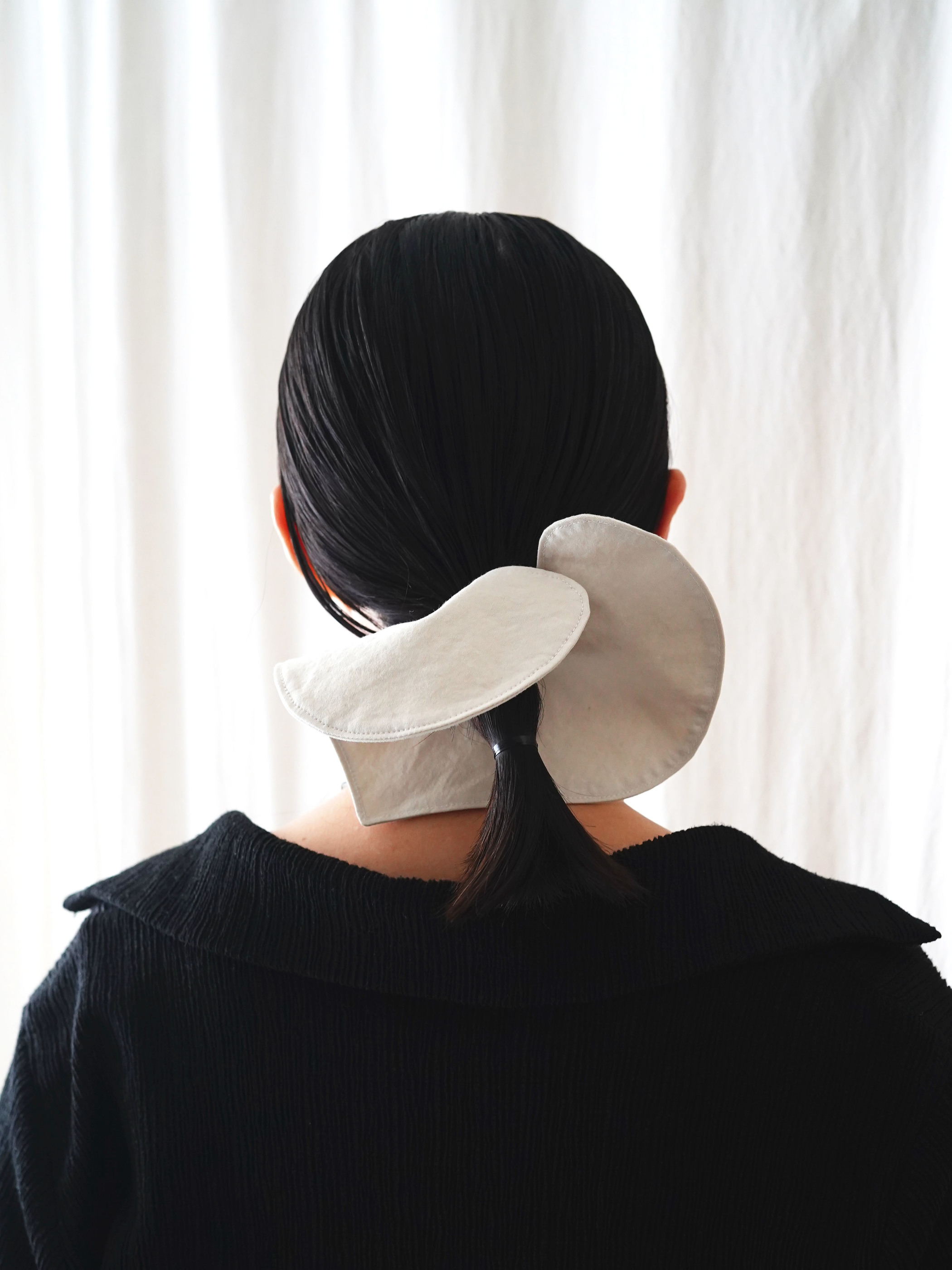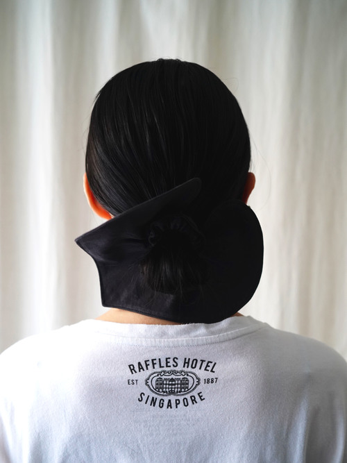 結んだ髪に背面のヘアゴム部分が手前になるように通すだけ、というシンプルな着脱方法です。